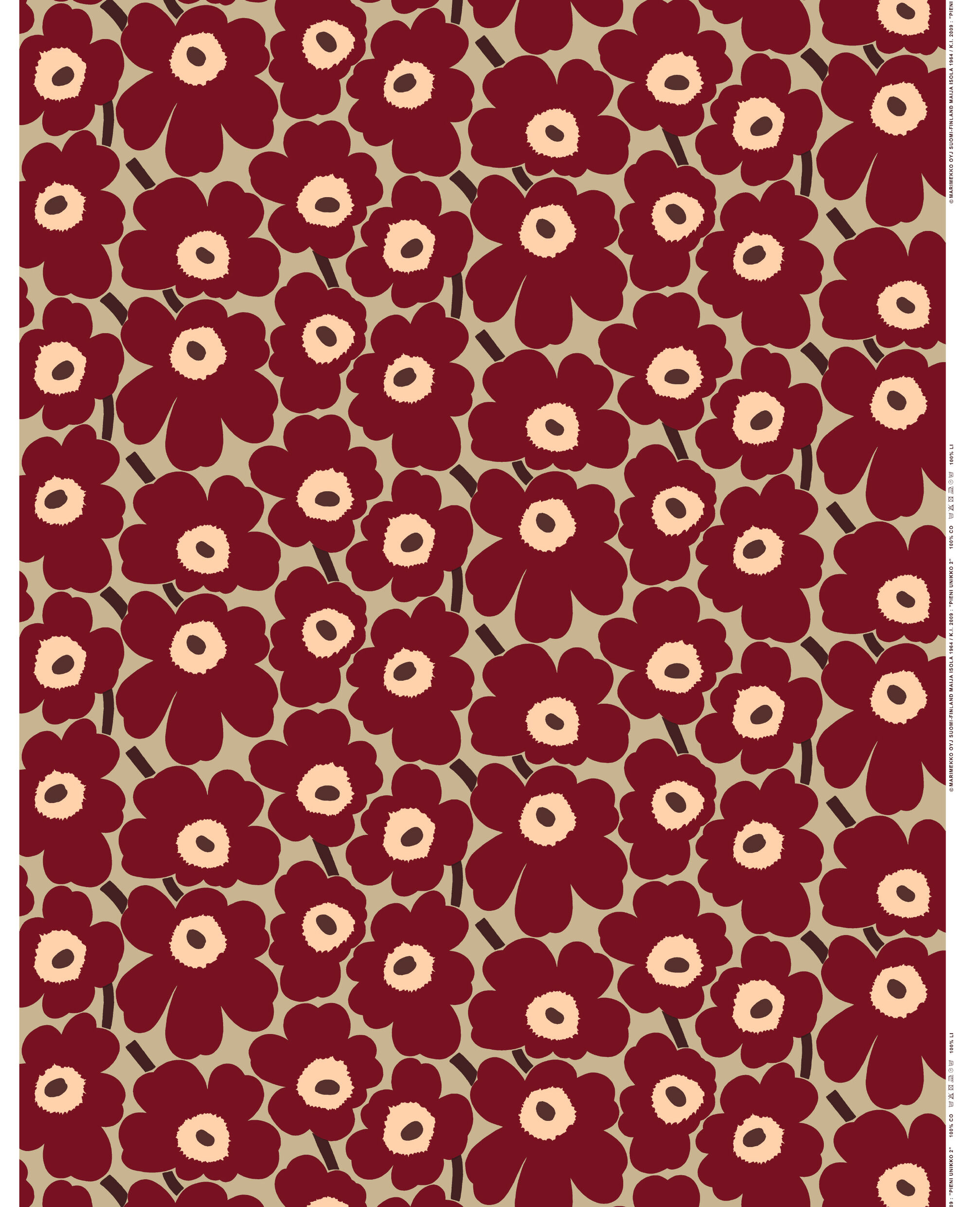 Akryylipinnoitetussa puuvillaprinttikankaassa on Pieni Unikko -kuosi, joka on painettu Helsingissä. Likaahylkivän pintakäsittelynsä ansiosta kangas on helppo pyyhkiä puhtaaksi kostealla liinalla.