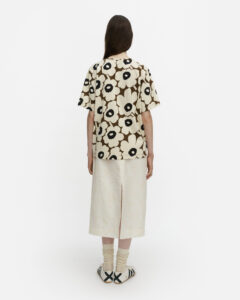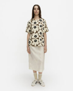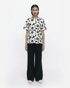 Tunnit-t-paita on valmistettu puuvillatrikoosta, ja siinä on rento istuvuus, suora leikkaus sekä Unikko-kuosi. T-paidassa on omalla kankaalla viimeistelty pyöreä pääntie.